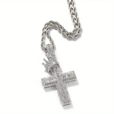 ヨーロッパ&アメリカン フルジルコニウム クラウンクロス ペンダント ネックレス メンズ 銅製 合成ジルコニア インレイ ヒップホップ パンク トレンド 個性派世代